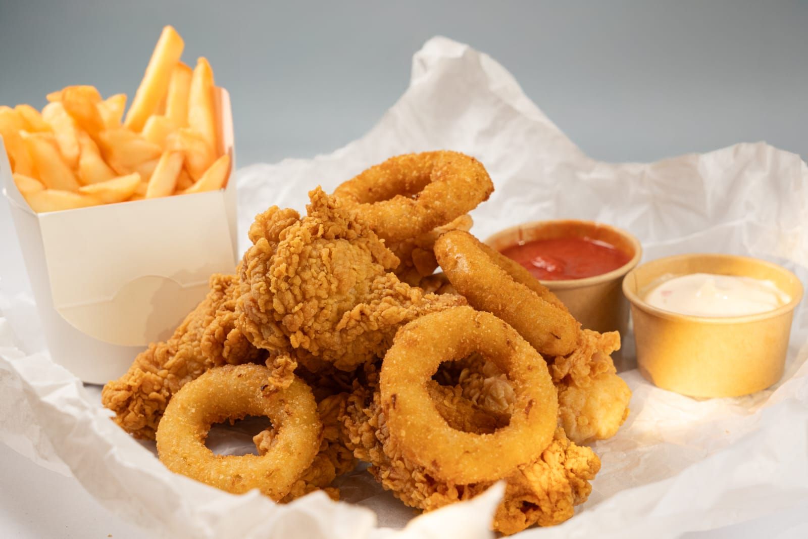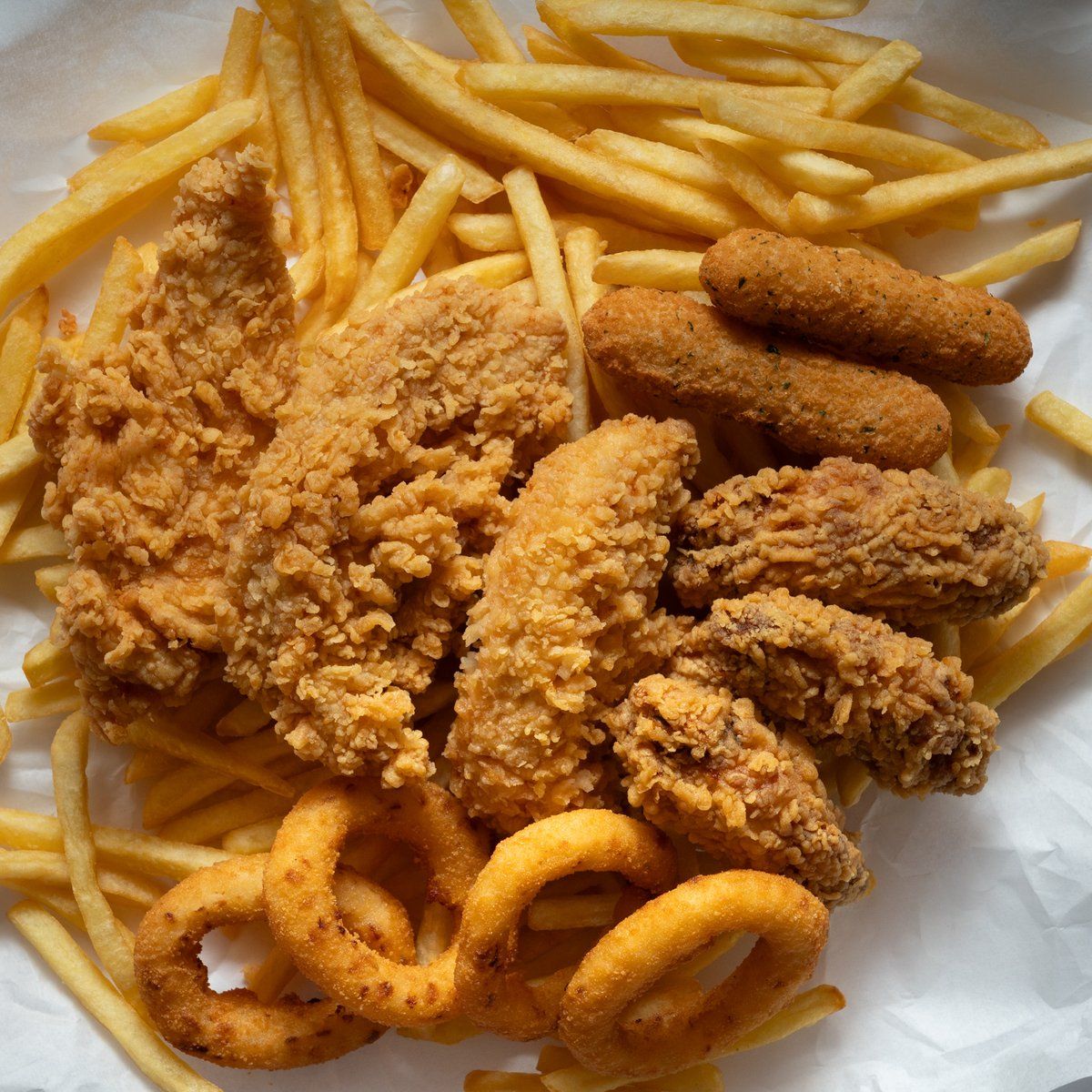 3 strips, 3 aripioare , 2 mozzarella sticks , 4 onion rings , portie de cartofi, un sos la alegere