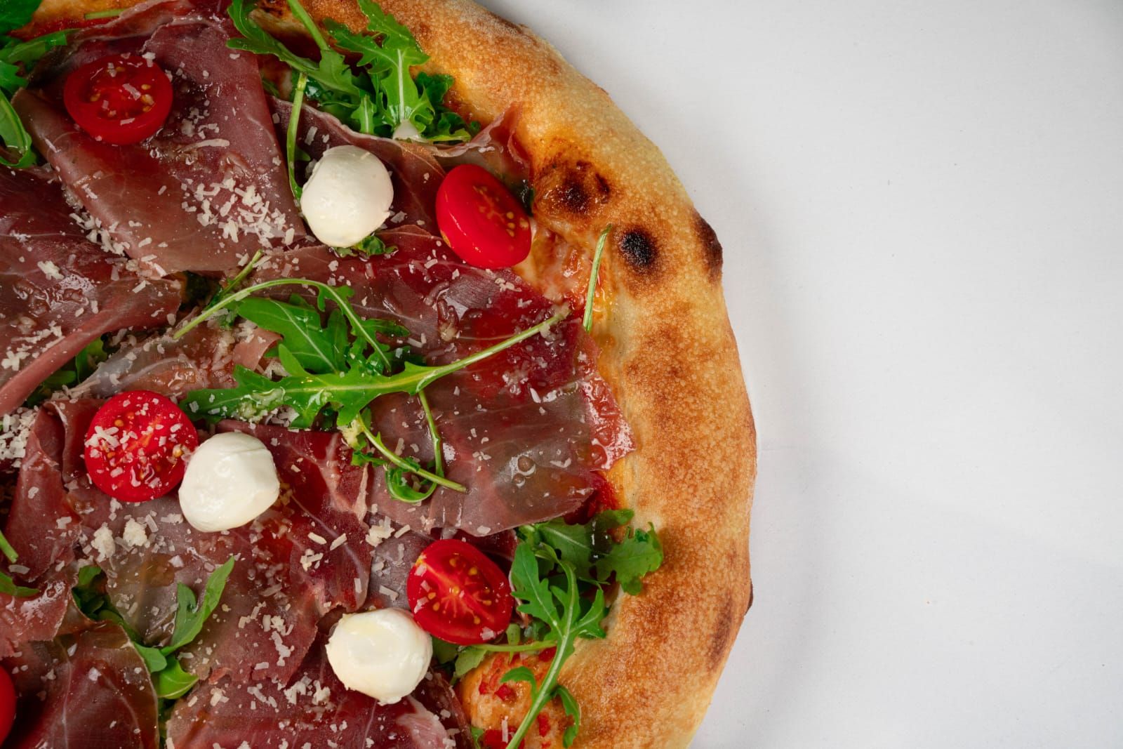 sos rosii, mozzarella, prosciutto crudo, rosii cherry, ruccola, ulei masline, parmeggiano