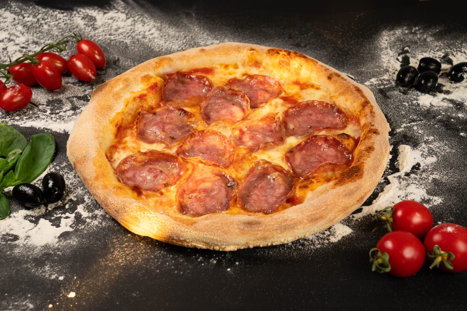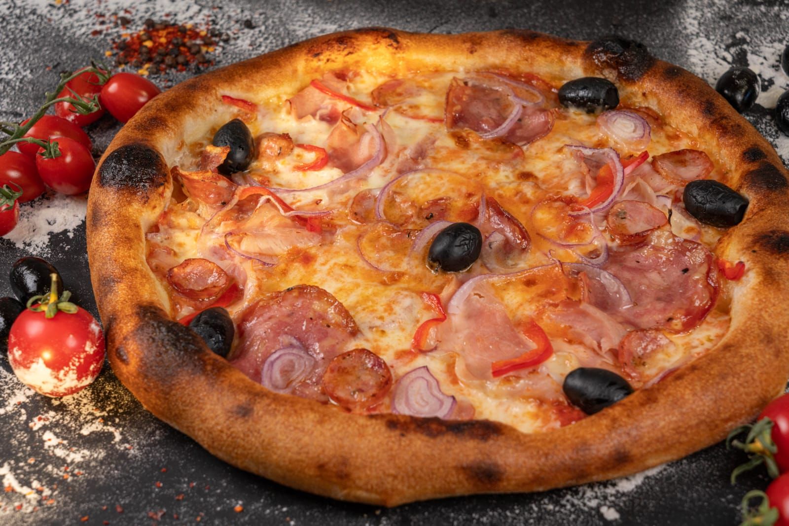 sos rosii, mozzarella, salam, sunca presata, ciuperci, masline