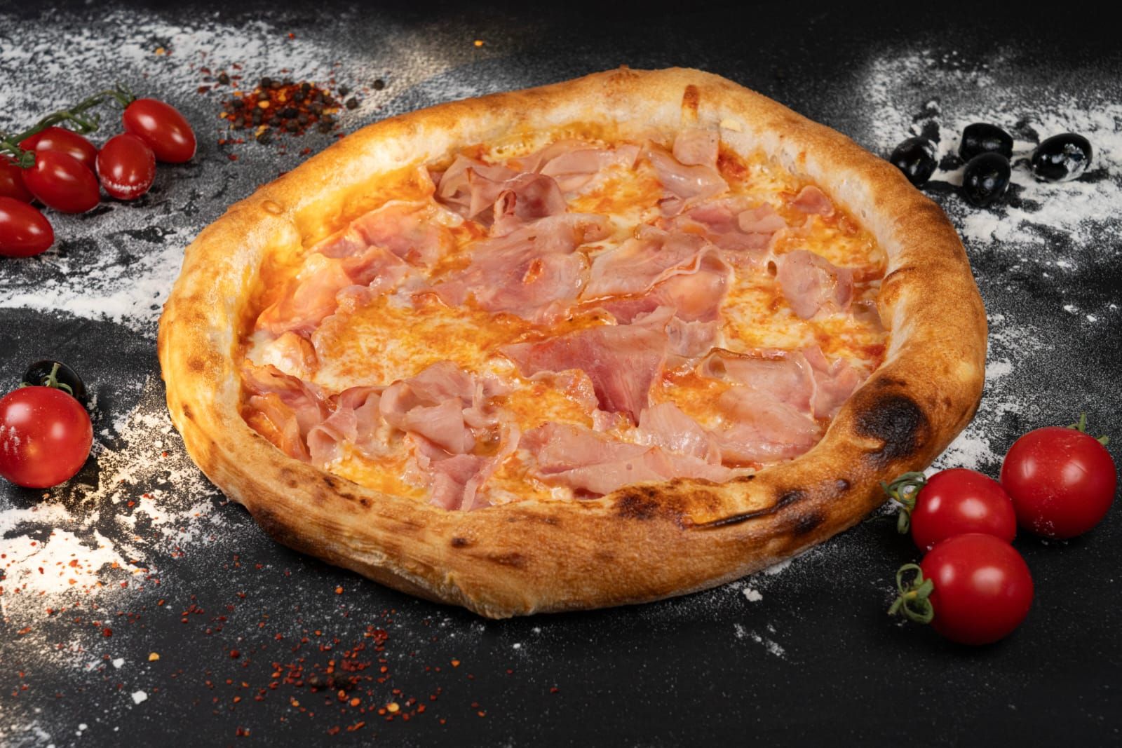 sos rosii, mozzarella, sunca presata, ciuperci, masline