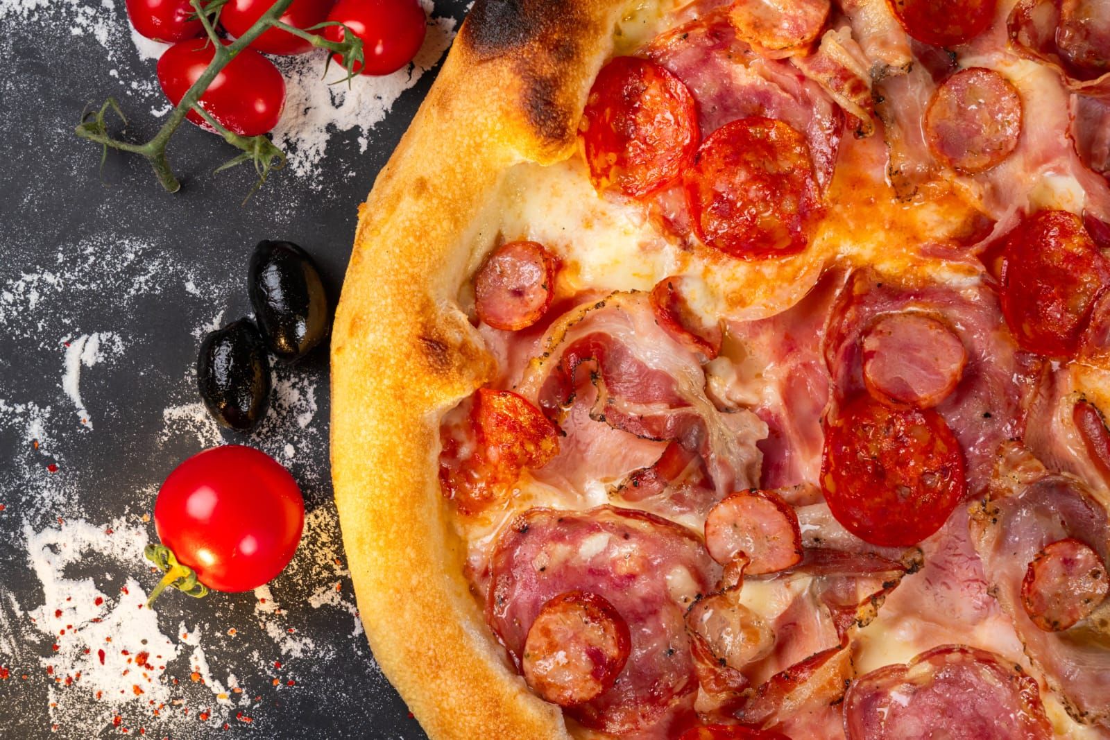 sos rosii, mozzarella, sunca presata praga, salam picant, bacon