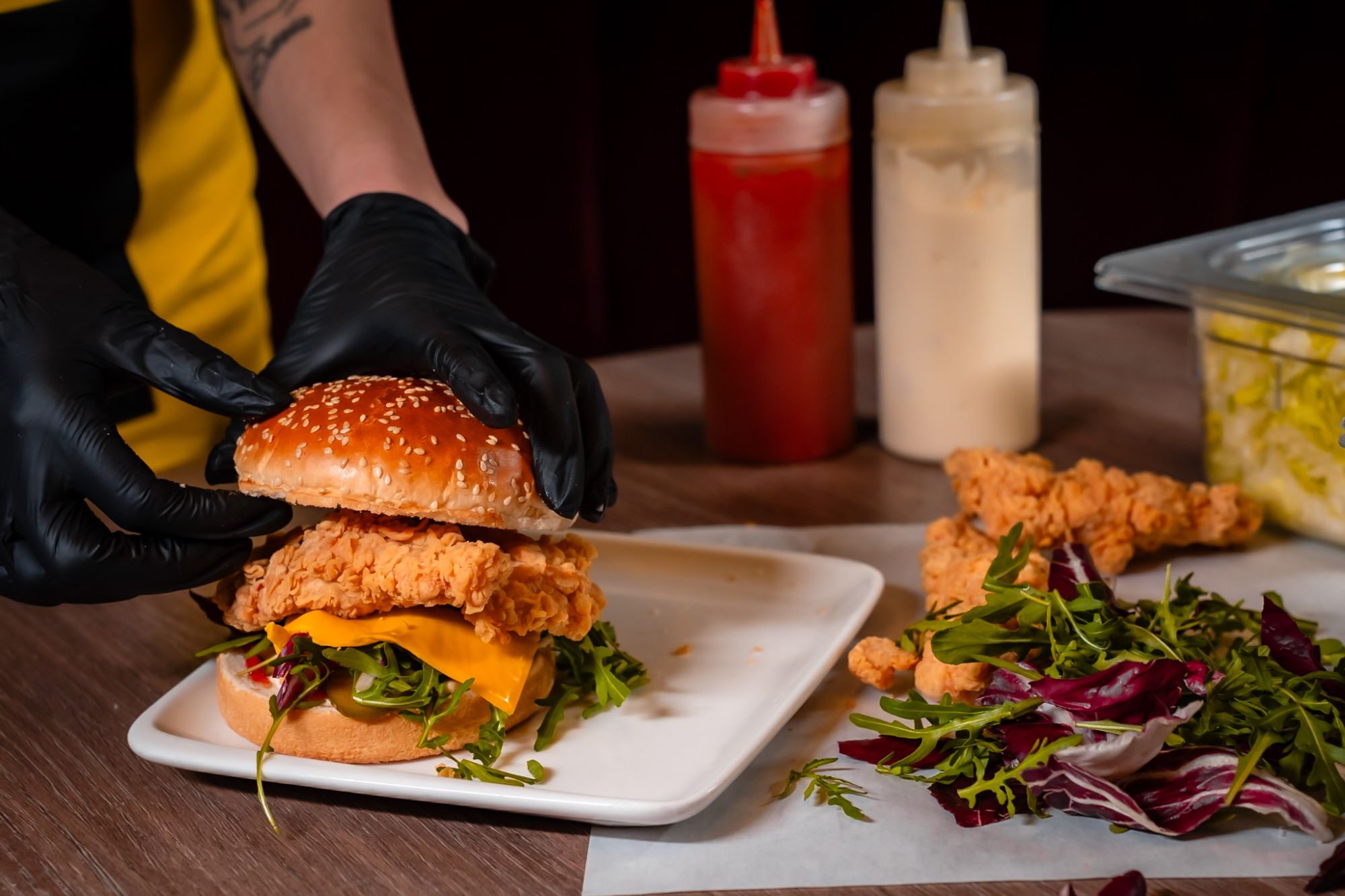 chifla burger, strips din carne de pui, ,maioneza, ketchup, salata, castraveti murati,cartofi prajiti,un sos la alegere