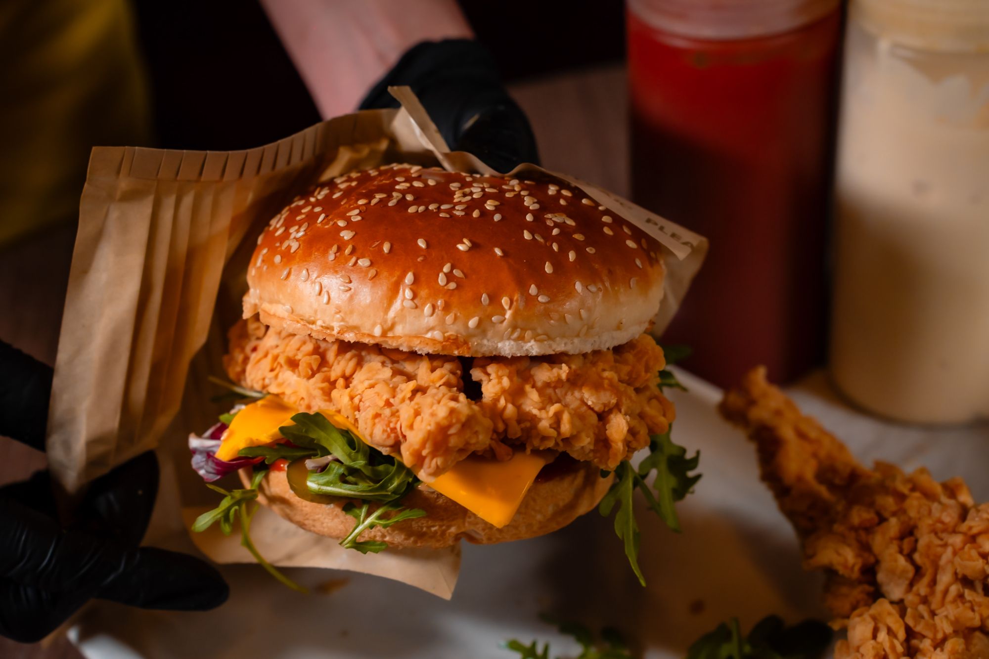 chifla burger, strips din carne de pui,sos cheddar, salata, castraveti murati,ketchup,maioneza,cartofi prajiti,un sos la alegere